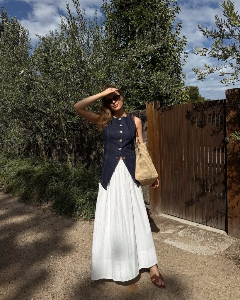 8.Cotton Skirt+ Button Up Blouse: A summer staple – light skirts keep you cool and stylish all day.Pair with a tie front blouse or cropped shirt for a soft,romantic vibe.
